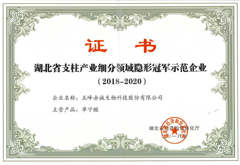 Certificate of invisible champion demonstration enterprise in pillar industry subdivision